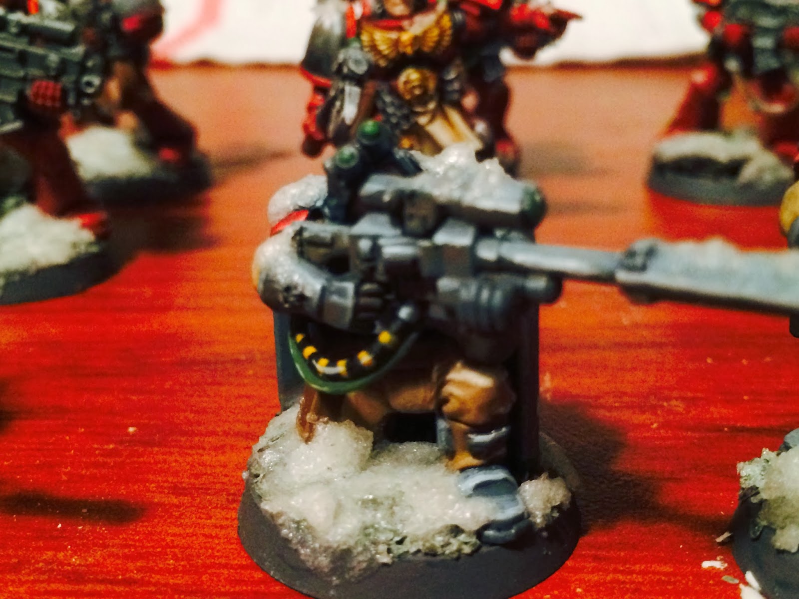 Well, I did this almost a month ago, but its progress all the same! The Secret Weapon Miniatures ground glass snow works incredibly well. The kit I purchase came with "Realistic Water" solution that can be used as an adhesive but I didn't want the snow to look too wet. I Just went with PVA instead. You can see some looking a bit mushier (like on the plasma cannon marine) and some looking a bit flakier. This came from adding more or less glue. Both seem to be staying on equally well.
